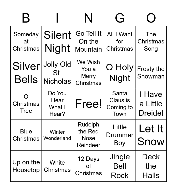 This bingo card has a free space and 24 words: Winter Wonderland, White Christmas, We Wish You a Merry Christmas, Up on the Housetop, The Christmas Song, Someday at Christmas, Silver Bells, Silent Night, Santa Claus is Coming to Town, Rudolph the Red Nose Reindeer, O Holy Night, O Christmas Tree, Little Drummer Boy, Let It Snow, Jolly Old St. Nicholas, Jingle Bell Rock, I Have a Little Dreidel, Go Tell It On the Mountain, Frosty the Snowman, Do You Hear What I Hear?, Deck the Halls, Blue Christmas, All I Want for Christmas and 12 Days of Christmas.