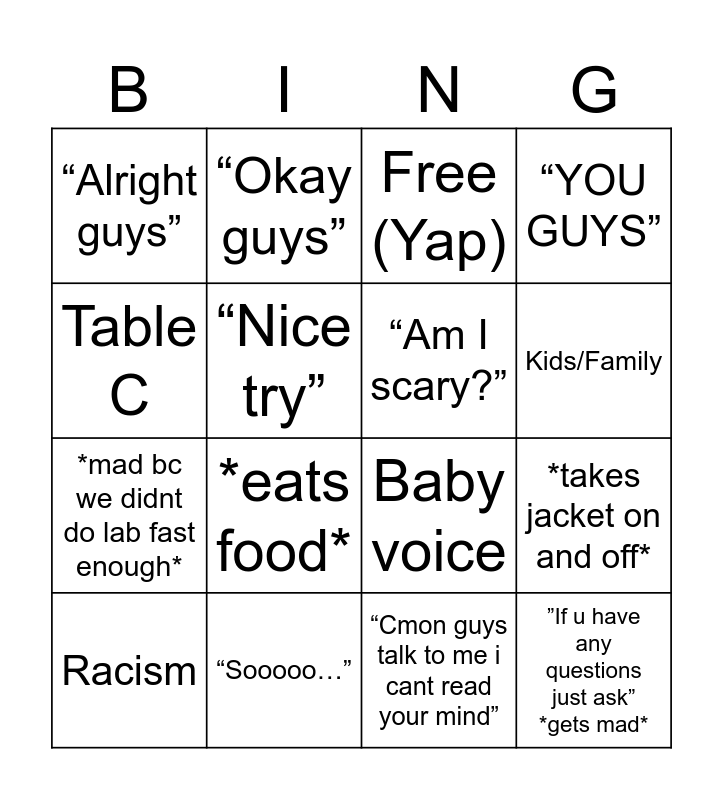 This bingo card has 23 words: ”If u have any questions just ask” *gets mad*, Husband, Kids/Family, Herself, Table C, “Alright guys”, “Nice try”, “Okay guys”, Racism, “Honey”/“sweetie”, *eats food*, *mad bc we didnt do lab fast enough*, *glazes*, *Tweaks*, “Sooooo…”, *forced laughter*, Free (Yap), Baby voice, “Am I scary?”, *takes jacket on and off*, “YOU GUYS”, “Cmon guys talk to me i cant read your mind” and “Why do I even teach anymore”.
