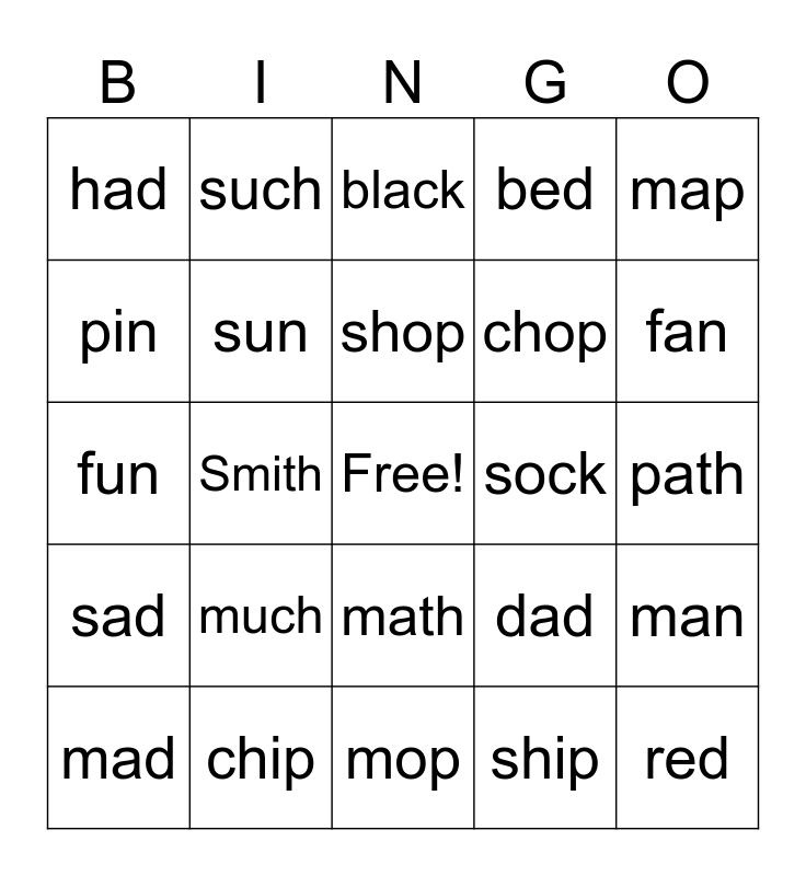 This bingo card has a free space and 24 words: much, chip, shop, mad, map, had, pin, such, sock, math, chop, fun, dad, man, sun, ship, path, black, fan, Smith, red, sad, bed and mop.