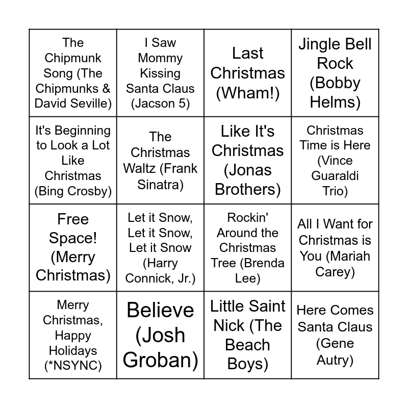 This bingo card has 20 words: Merry Christmas, Happy Holidays (*NSYNC), Feliz Navidad (Jose Feliciano), Last Christmas (Wham!), All I Want for Christmas is You (Mariah Carey), You're a Mean One Mr. Grinch (Jim Carrey), Let it Snow, Let it Snow, Let it Snow (Harry Connick, Jr.), Little Saint Nick (The Beach Boys), Jingle Bell Rock (Bobby Helms), Free Space! (Merry Christmas), I Saw Mommy Kissing Santa Claus (Jacson 5), Rockin' Around the Christmas Tree (Brenda Lee), Christmas Time is Here (Vince Guaraldi Trio), The Chipmunk Song (The Chipmunks & David Seville), Believe (Josh Groban), Like It's Christmas (Jonas Brothers), Santa Tell Me (Ariana Grande), It's Beginning to Look a Lot Like Christmas (Bing Crosby), The Christmas Waltz (Frank Sinatra), Home for the Holidays (Pentatonix) and Here Comes Santa Claus (Gene Autry).