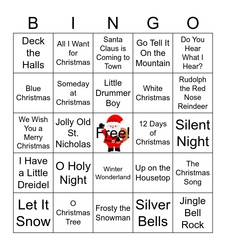 This bingo card has a free space and 24 words: O Holy Night, O Christmas Tree, Little Drummer Boy, Let It Snow, Do You Hear What I Hear?, Deck the Halls, Blue Christmas, All I Want for Christmas, 12 Days of Christmas, Winter Wonderland, White Christmas, We Wish You a Merry Christmas, Up on the Housetop, The Christmas Song, Someday at Christmas, Silver Bells, Silent Night, Santa Claus is Coming to Town, Rudolph the Red Nose Reindeer, Jolly Old St. Nicholas, Jingle Bell Rock, I Have a Little Dreidel, Go Tell It On the Mountain and Frosty the Snowman.