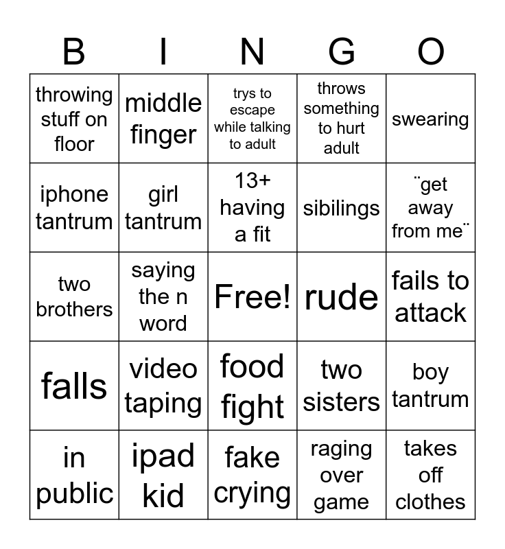 This bingo card has a free space and 24 words: video taping, ipad kid, 13+ having a fit, in public, swearing, throwing stuff on floor, iphone tantrum, middle finger, rude, food fight, sibilings, two brothers, two sisters, boy tantrum, girl tantrum, raging over game, fails to attack, trys to escape while talking to adult, ¨get away from me¨, saying the n word, takes off clothes, falls, throws something to hurt adult and fake crying.