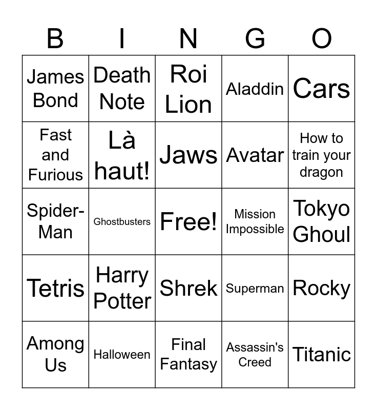 This bingo card has a free space and 24 words: Harry Potter, Halloween, Jaws, Among Us, Cars, James Bond, Fast and Furious, Death Note, Mission Impossible, Shrek, Avatar, Spider-Man, Superman, Rocky, Là haut!, Assassin's Creed, Tokyo Ghoul, Roi Lion, How to train your dragon, Ghostbusters, Titanic, Tetris, Aladdin and Final Fantasy.
