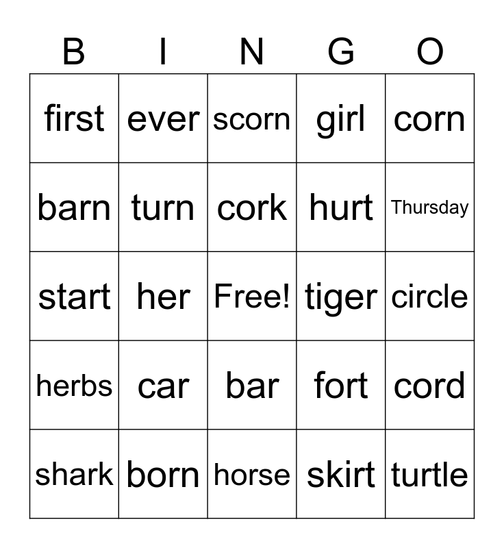This bingo card has a free space and 63 words: arm, clerk, bird, cord, blur, art, ever, birth, cork, curl, bar, germ, circle, corn, fur, barn, her, first, fork, hurt, car, herbs, girl, horn, purple, far, never, shirt, short, purse, jar, paper, sir, sort, Thursday, shark, teacher, skirt, torch, turn, start, tiger, twirl, torn, turtle, born, corn, fort, fork, form, forth, horse, morn, north, porch, scorn, short, sport, stork, storm, thorn, torn and worn.