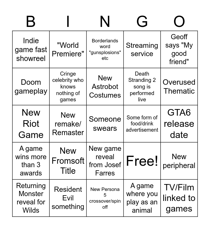 This bingo card has 25 words: New Fromsoft Title, New Persona 5 crossover/spin off, New Astrobot Costumes, Returning Monster reveal for Wilds, Geoff says "My good friend", Indie game fast showreel, Doom gameplay, "World Premiere", Some form of food/drink advertisement, New game reveal from Josef Farres, Death Stranding 2 song is performed live, New Riot Game, Free!, New peripheral, Cringe celebrity who knows nothing of games, TV/Film linked to games, GTA6 release date, Borderlands word "gunsplosions" etc, Overused Thematic, New remake/ Remaster, Someone swears, Resident Evil something, A game wins more than 3 awards, Streaming service and A game where you play as an animal.
