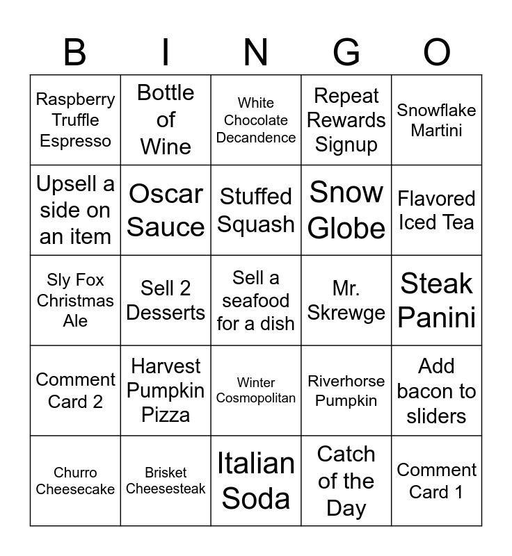 This bingo card has a free space and 24 words: Harvest Pumpkin Pizza, Brisket Cheesesteak, Stuffed Squash, Churro Cheesecake, Snowflake Martini, Raspberry Truffle Espresso, Upsell a side on an item, Bottle of Wine, Mr. Skrewge, Winter Cosmopolitan, Snow Globe, Sly Fox Christmas Ale, Riverhorse Pumpkin, Add bacon to sliders, Oscar Sauce, Catch of the Day, Steak Panini, White Chocolate Decandence, Flavored Iced Tea, Sell 2 Desserts, Comment Card 1, Comment Card 2, Repeat Rewards Signup and Italian Soda.