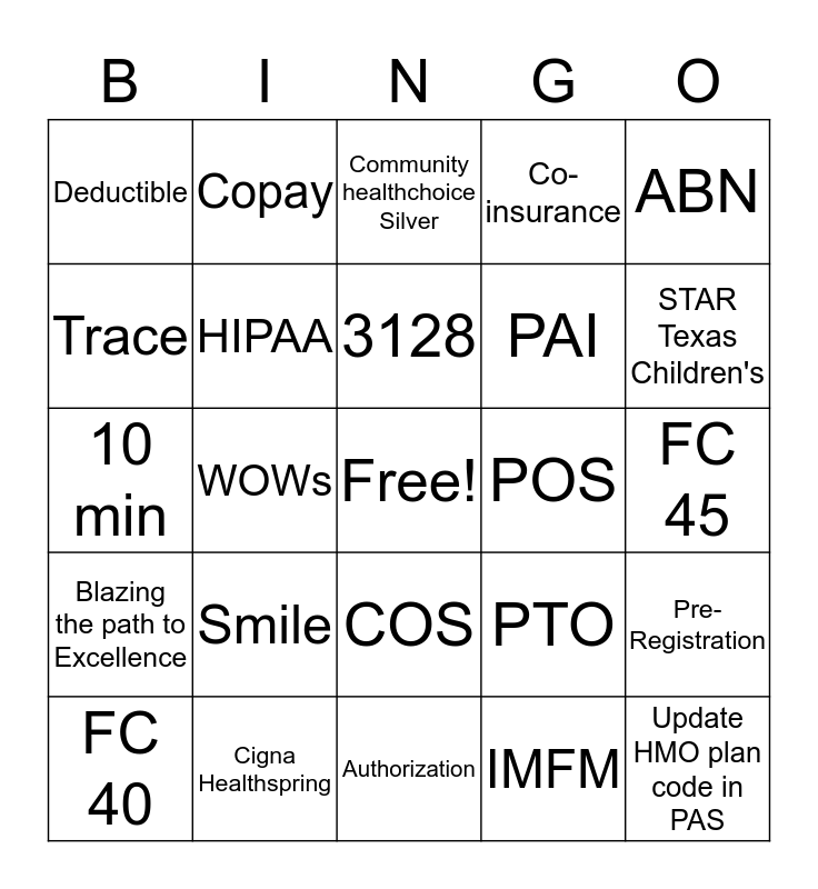 This bingo card has a free space and 24 words: Smile, Cigna Healthspring, 3128, FC 40, ABN, Deductible, Trace, Copay, POS, COS, PAI, 10 min, PTO, Pre-Registration, HIPAA, IMFM, FC 45, Community healthchoice Silver, STAR Texas Children's, WOWs, Update HMO plan code in PAS, Blazing the path to Excellence, Co-insurance and Authorization.