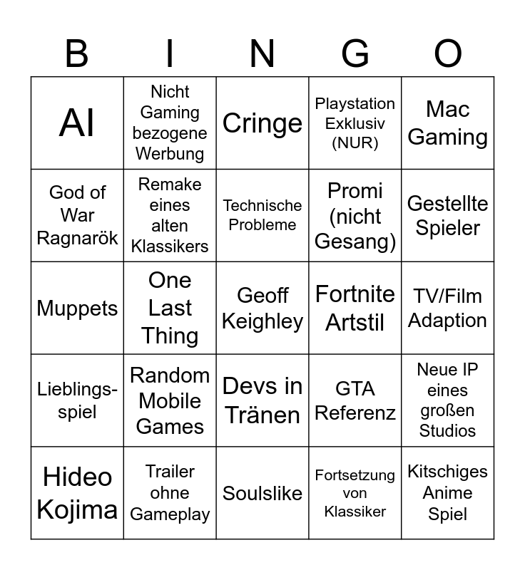 This bingo card has a free space and 24 words: Random Mobile Games, Trailer ohne Gameplay, Technische Probleme, Hideo Kojima, Mac Gaming, AI, God of War Ragnarök, Nicht Gaming bezogene Werbung, Fortnite Artstil, Devs in Tränen, Promi (nicht Gesang), Muppets, GTA Referenz, Neue IP eines großen Studios, Remake eines alten Klassikers, Fortsetzung von Klassiker, TV/Film Adaption, Cringe, Gestellte Spieler, One Last Thing, Kitschiges Anime Spiel, Lieblings-spiel, Playstation Exklusiv (NUR) and Soulslike.
