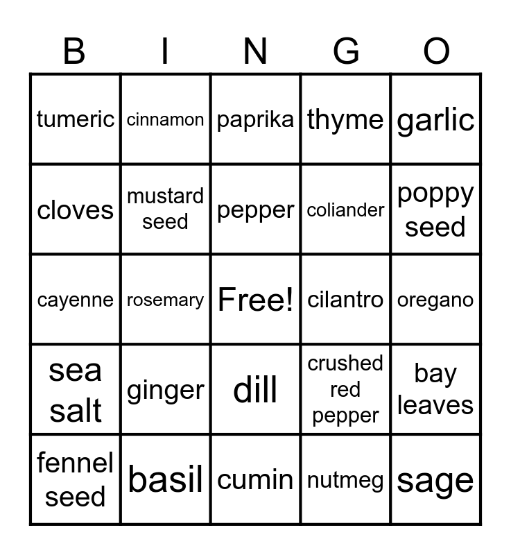 This bingo card has a free space and 24 words: ginger, basil, pepper, fennel seed, garlic, tumeric, cloves, cinnamon, cilantro, dill, coliander, cayenne, crushed red pepper, bay leaves, mustard seed, nutmeg, oregano, paprika, poppy seed, rosemary, sage, sea salt, thyme and cumin.