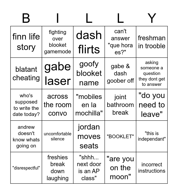 This bingo card has a free space and 29 words: "disrespectful", "this is high school", across the room convo, nextdoor loud audio, finn life story, dash flirts, gabe laser, uncomfortable silence, joint bathroom break, freshies break down laughing, "do you need to leave", incorrect instructions, "shhh... next door is an AP class", "are you on the moon", asking someone a question they dont get to answer, "this will be homework", jordan moves seats, andrew doesn't know whats going on, freshman in trooble, who's supposed to write the date today?, "BOOKLET", gabe make a noise he weren't meant to make, gabe & dash goober off, blatant cheating, can't answer "que hora es?", fighting over blooket gamemode, "this is independant", goofy blooket name and fighting over who can correct the date.