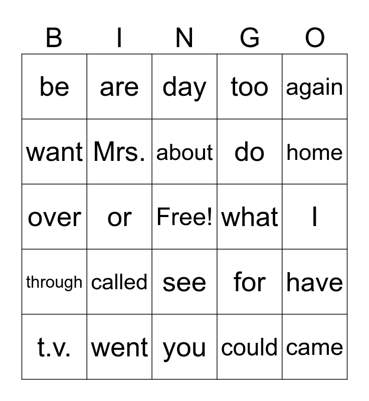 This bingo card has a free space and 27 words: for, me, do, you, want, day, are, through, what, have, over, too, t.v., went, home, new, Mrs., about, called, be, I, could, or, came, see, again and they.