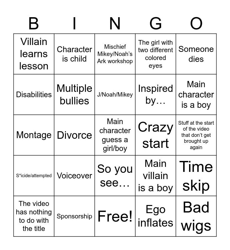 This bingo card has 25 words: S*icide/attempted, Sponsorship, Main character guess a girl/boy, Ego inflates, Someone dies, Villain learns lesson, Character is child, Mischief Mikey/Noah’s Ark workshop, Crazy start, Time skip, Disabilities, Multiple bullies, Free!, Main villain is a boy, Main character is a boy, The video has nothing to do with the title, Divorce, J/Noah/Mikey, Inspired by…, Stuff at the start of the video that don’t get brought up again, Montage, Voiceover, So you see…, The girl with two different colored eyes and Bad wigs.