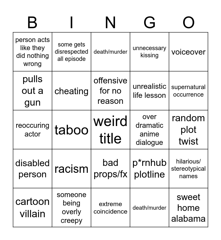 This bingo card has a free space and 24 words: racism, someone being overly creepy, offensive for no reason, cartoon villain, voiceover, person acts like they did nothing wrong, pulls out a gun, some gets disrespected all episode, over dramatic anime dialogue, bad props/fx, unrealistic life lesson, reoccuring actor, p*rnhub plotline, hilarious/ stereotypical names, cheating, death/murder, random plot twist, death/murder, supernatural occurrence, taboo, sweet home alabama, disabled person, unnecessary kissing and extreme coincidence.