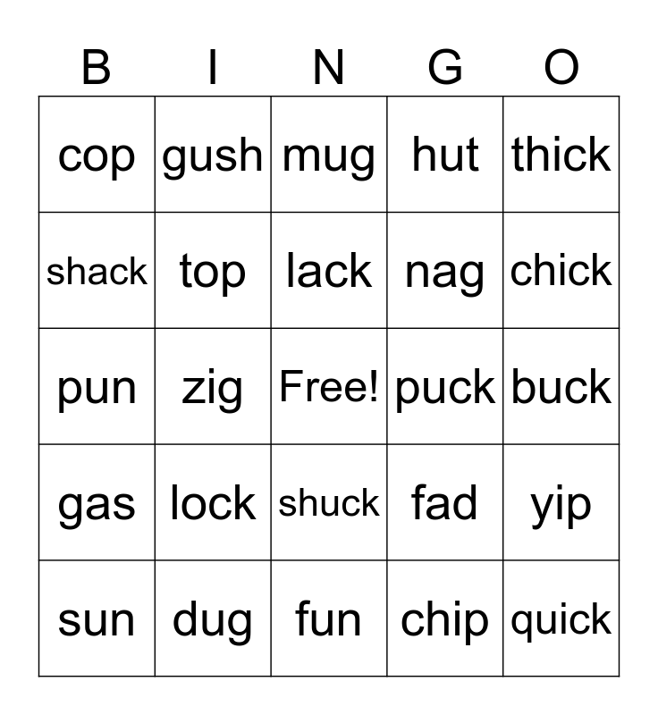 This bingo card has a free space and 24 words: lock, dug, lack, sun, thick, cop, shack, gush, puck, shuck, nag, pun, fad, yip, top, chip, buck, mug, chick, zig, quick, gas, hut and fun.