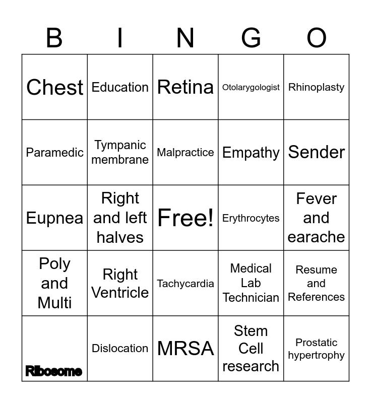 This bingo card has a free space and 29 words: Ribosome, Cranial Cavity, Right and left halves, Contractions of the heart, Chest, Retina, Tympanic membrane, Right Ventricle, Erythrocytes, Dislocation, Fever and earache, Prostatic hypertrophy, MRSA, Stem Cell research, Sender, Cyst, Tachycardia, Poly and Multi, Rhinoplasty, Eupnea, Medical Lab Technician, Medicaid, Empathy, Paramedic, Otolarygologist, Education, Resume and References, Malpractice and Consent implied.