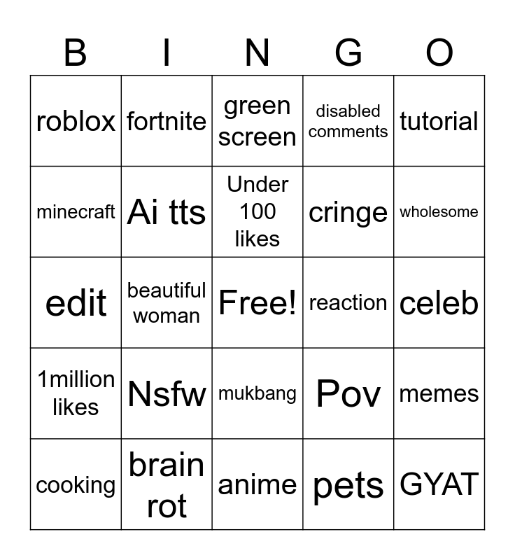 This bingo card has a free space and 24 words: Nsfw, brain rot, Under 100 likes, cooking, tutorial, roblox, minecraft, fortnite, reaction, mukbang, cringe, edit, Pov, memes, Ai tts, pets, celeb, green screen, wholesome, beautiful woman, GYAT, 1million likes, disabled comments and anime.