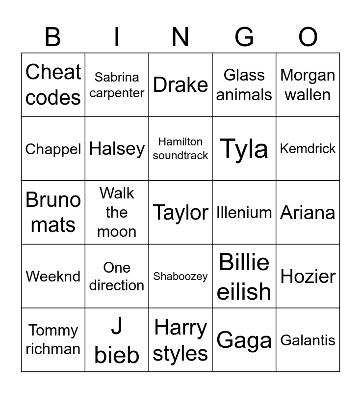 This bingo card has a free space and 24 words: One direction, J bieb, Hamilton soundtrack, Tommy richman, Morgan wallen, Cheat codes, Chappel, Sabrina carpenter, Illenium, Shaboozey, Tyla, Bruno mats, Billie eilish, Hozier, Halsey, Gaga, Ariana, Drake, Kemdrick, Walk the moon, Galantis, Weeknd, Glass animals and Harry styles.
