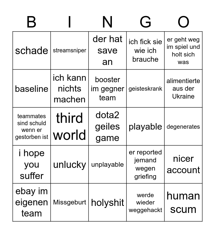 This bingo card has a free space and 24 words: unlucky, Missgeburt, booster im gegner team, ebay im eigenen team, er geht weg im spiel und holt sich was, schade, baseline, streamsniper, playable, unplayable, geisteskrank, teammates sind schuld wenn er gestorben ist, er reported jemand wegen griefing, nicer account, ich kann nichts machen, werde wieder weggehackt, degenerates, der hat save an, alimentierte aus der Ukraine, third world, human scum, i hope you suffer, ich fick sie wie ich brauche and holyshit.