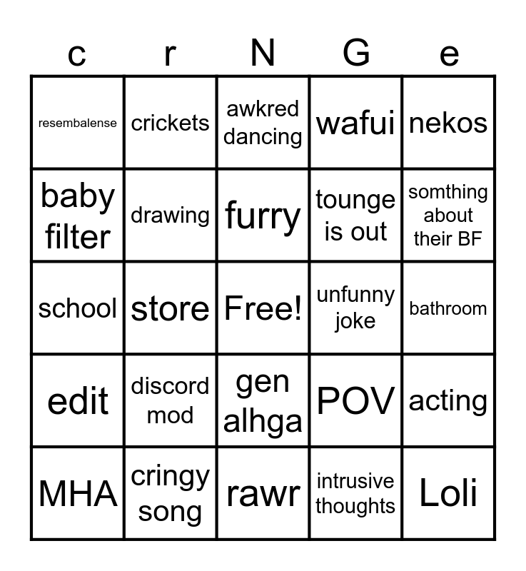 This bingo card has a free space and 24 words: discord mod, cringy song, furry, MHA, nekos, resembalense, baby filter, crickets, unfunny joke, gen alhga, tounge is out, school, POV, acting, drawing, intrusive thoughts, bathroom, awkred dancing, somthing about their BF, store, Loli, edit, wafui and rawr.