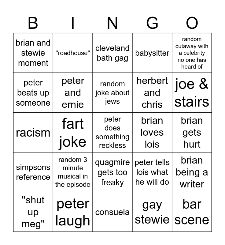 This bingo card has a free space and 24 words: random 3 minute musical in the episode, peter laugh, random joke about jews, ''shut up meg'', random cutaway with a celebrity no one has heard of, brian and stewie moment, peter beats up someone, ''roadhouse'', brian loves lois, quagmire gets too freaky, herbert and chris, racism, peter tells lois what he will do, brian being a writer, peter and ernie, gay stewie, brian gets hurt, cleveland bath gag, joe & stairs, fart joke, bar scene, simpsons reference, babysitter and consuela.