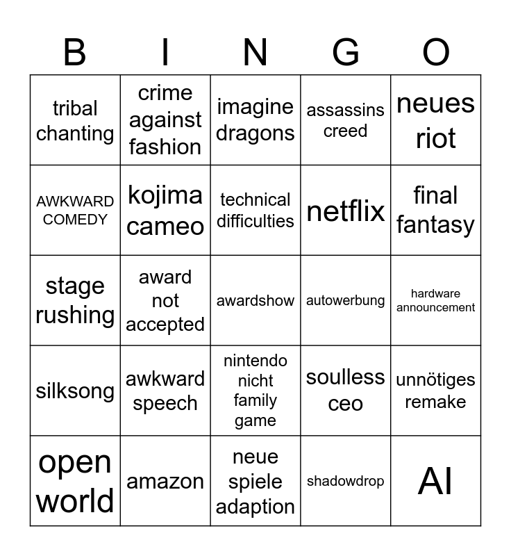 This bingo card has a free space and 24 words: awkward speech, amazon, technical difficulties, open world, neues riot, tribal chanting, AWKWARD COMEDY, crime against fashion, autowerbung, nintendo nicht family game, netflix, stage rushing, soulless ceo, unnötiges remake, kojima cameo, shadowdrop, hardware announcement, imagine dragons, final fantasy, award not accepted, AI, silksong, assassins creed and neue spiele adaption.