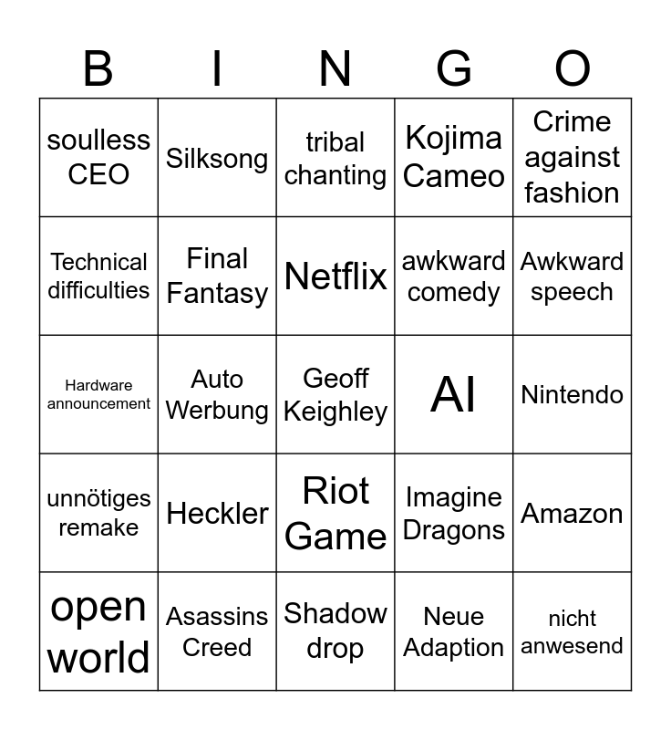 This bingo card has a free space and 24 words: Heckler, Asassins Creed, Netflix, open world, Crime against fashion, soulless CEO, Technical difficulties, Silksong, AI, Riot Game, awkward comedy, Hardware announcement, Imagine Dragons, Amazon, Final Fantasy, Neue Adaption, Nintendo, tribal chanting, Awkward speech, Auto Werbung, nicht anwesend, unnötiges remake, Kojima Cameo and Shadow drop.