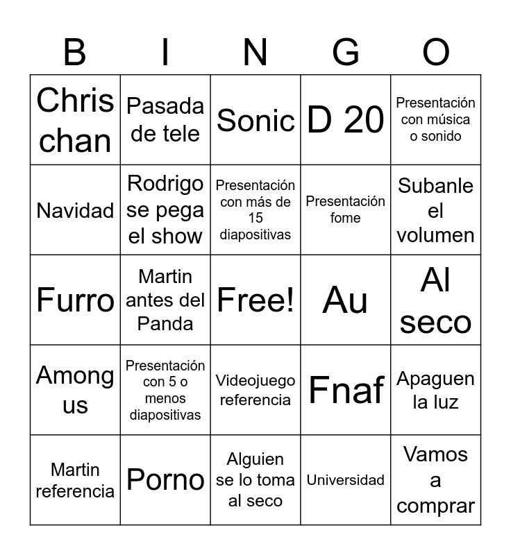 This bingo card has a free space and 24 words: Presentación con 5 o menos diapositivas, Porno, Presentación con más de 15 diapositivas, Martin referencia, Presentación con música o sonido, Chris chan, Navidad, Pasada de tele, Au, Videojuego referencia, Presentación fome, Furro, Fnaf, Apaguen la luz, Rodrigo se pega el show, Universidad, Al seco, Sonic, Subanle el volumen, Martin antes del Panda, Vamos a comprar, Among us, D 20 and Alguien se lo toma al seco.