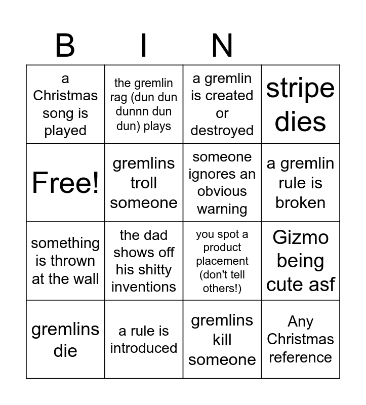 This bingo card has 16 words: a rule is introduced, Gizmo being cute asf, a gremlin is created or destroyed, a Christmas song is played, something is thrown at the wall, the gremlin rag (dun dun dunnn dun dun) plays, you spot a product placement (don't tell others!), gremlins kill someone, Free!, gremlins troll someone, gremlins die, stripe dies, the dad shows off his shitty inventions, a gremlin rule is broken, someone ignores an obvious warning and Any Christmas reference.