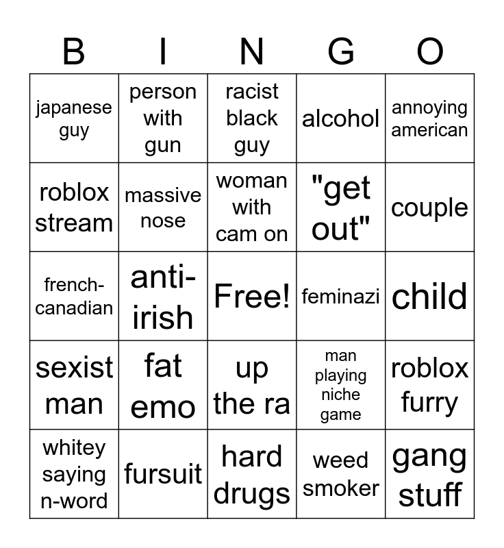 This bingo card has a free space and 24 words: whitey saying n-word, fat emo, woman with cam on, weed smoker, annoying american, japanese guy, person with gun, racist black guy, feminazi, child, french-canadian, massive nose, man playing niche game, roblox furry, roblox stream, fursuit, hard drugs, alcohol, couple, sexist man, anti-irish, up the ra, "get out" and gang stuff.