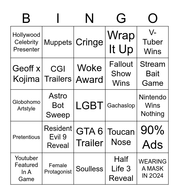 This bingo card has a free space and 24 words: Resident Evil 9 Reveal, Female Protagonist, Woke Award, Youtuber Featured In A Game, V-Tuber Wins, Hollywood Celebrity Presenter, Geoff x Kojima, Muppets, Gachaslop, GTA 6 Trailer, Fallout Show Wins, Globohomo Artstyle, Toucan Nose, 90% Ads, CGI Trailers, Half Life 3 Reveal, Nintendo Wins Nothing, Cringe, Stream Bait Game, Astro Bot Sweep, WEARING A MASK IN 2O24, Pretentious, Wrap It Up and Soulless.