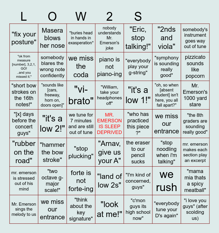 This bingo card has a free space and 48 words: "rubber on the road", "it's a low 2!", "think about the key signature", "Arnav, give us your A", "everybody play your g-string", we miss our entrance, somebody's instrument goes way out of tune, Mr. Emerson sings the melody to us, "sounds like [cars, freeway, horn on, doors open]", we tune for 7 minutes and are still out of tune, nobody understands Mr. Emerson's joke, "Eric, stop talking!", "oh, so when [absent student] isn't here, you all fall apart?", Mr. Emerson's 1000 yard stare, "[x] days before the concert guys", "two octave g-major scale!", *buries head in hands in exasperation*, "William, take your headphones off", "I'm kind of concerned, guys", "2nds and viola", pizzicato sounds like popcorn, "ok from measure [number], 3,2,1, GO! ..and you missed it.", Masera blows her nose, we miss the coda, "c'mon guys its high school now", "symphony is sounding really good", "the 8th graders are sounding really good", mr. emerson is stressed out of his mind, "hammer the bow stroke", "vi-brato", "land of low 2s", "it's a low 1!", we rush, "mama mia thats a spicy meatball", "fix your posture", we miss our entrance, "stop plucking", "look at me!", "who has practiced this piece ?", "everybody tune your D's again", mr. emerson makes each section play an excerpt, "short bow strokes on the 16th notes!", somebody blares the wrong note confidently, forte is not forte-ing, piano is not piano-ing, the eraser to our pencil sucks, "stop noodling when i'm talking" and "i love you guys" (after scolding us).