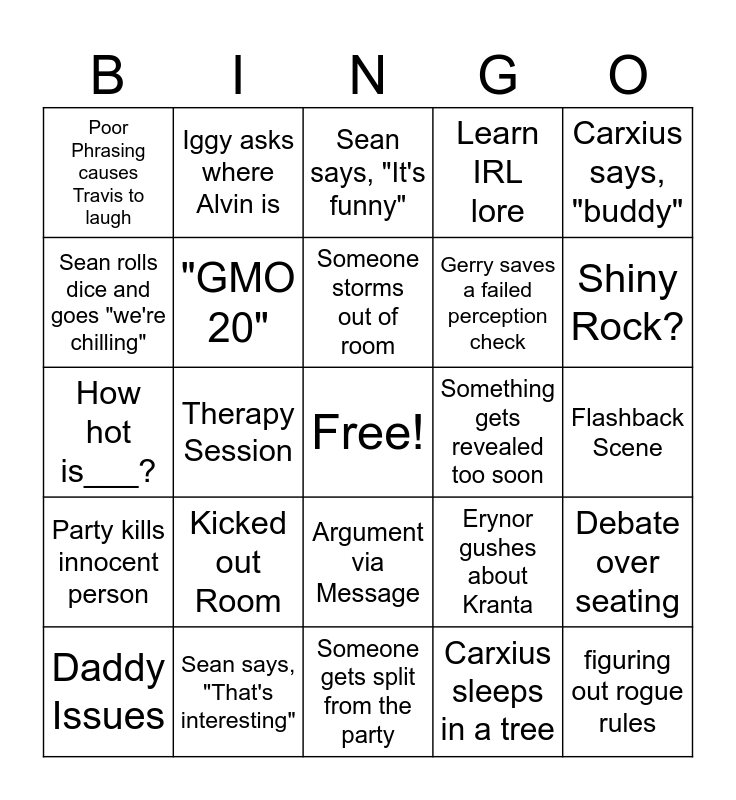 This bingo card has a free space and 24 words: Kicked out Room, Sean says, "That's interesting", Someone storms out of room, Daddy Issues, Carxius says, "buddy", Poor Phrasing causes Travis to laugh, Sean rolls dice and goes "we're chilling", Iggy asks where Alvin is, Something gets revealed too soon, Argument via Message, Gerry saves a failed perception check, How hot is___?, Erynor gushes about Kranta, Debate over seating, "GMO 20", Carxius sleeps in a tree, Flashback Scene, Sean says, "It's funny", Shiny Rock?, Therapy Session, figuring out rogue rules, Party kills innocent person, Learn IRL lore and Someone gets split from the party.
