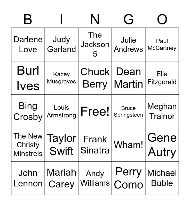 This bingo card has a free space and 24 words: Taylor Swift, Mariah Carey, Chuck Berry, John Lennon, Paul McCartney, Darlene Love, Burl Ives, Judy Garland, Bruce Springsteen, Frank Sinatra, Dean Martin, Bing Crosby, Wham!, Gene Autry, Kacey Musgraves, Perry Como, Meghan Trainor, The Jackson 5, Ella Fitzgerald, Louis Armstrong, Michael Buble, The New Christy Minstrels, Julie Andrews and Andy Williams.
