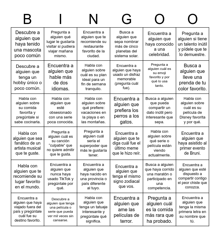 This bingo card has 36 words: Encuentra a alguien que tenga el mismo signo zodiacal que vos., Encuentra a alguien que haya nacido en una provincia o país diferente al tuyo., Encuentra a alguien que ame las películas de terror., Descubre a alguien que tenga un hobby único o poco común., Habla con alguien que sea fanático de un artista musical que te guste., Encuentra a alguien que prefiera los perros a los gatos., Encuentra a alguien que hable más de dos idiomas., Habla con alguien que tenga un tatuaje interesante y pregúntale qué significa., Encuentra a alguien que haya conocido a una celebridad., Busca a alguien que haya corrido una maratón o participado en una competencia., Busca a alguien que lleve una prenda de tu color favorito., Busca a alguien que sepa nombrar más de cinco planetas del sistema solar., Encuentra a alguien que esté dispuesto a compartir contigo el peor chiste que conozca., Habla con alguien que esté obsesionado con una serie poca conocida., Encuentra a alguien que haya usado un disfraz memorable (pregunta cuál fue)., Descubre a alguien que haya tenido una mascota poco común, Habla con alguien que te recomiende su lugar favorito en el mundo., Busca a alguien que pueda compartir un dato inútil pero interesante que sepa., Habla con alguien sobre su comida favorita y pregúntale si sabe cocinarla., Encuentra a alguien que te recomiende su restaurante favorito de la ciudad., Habla con alguien sobre qué prefiere: vacaciones en la playa o en las montañas., Pregunta a alguien cuál es su canción “culpable” que no quiere admitir que le gusta., Encuentra a alguien que te diga cuál fue el último meme que le hizo reír., Pregunta a alguien cuál sería el superpoder que más le gustaría tener., Habla con alguien sobre qué serie o película están viendo actualmente., Pregunta a alguien qué lugar le gustaría visitar si pudiera viajar mañana mismo., Pregunta a alguien cuál es su emoji favorito y por qué lo usa tanto., Descubre a alguien que tenga una película o serie que pueda ver mil veces sin cansarse., Habla con alguien sobre cuál es su plan ideal para un fin de semana tranquilo., Pregunta a alguien si tiene un talento inútil y pídele que te lo demuestre., Encuentra a alguien que tenga la misma primera letra en su nombre que tú., Encuentra a alguien que haya viajado fuera del país y pregúntale cuál fue su destino favorito., Encuentra a alguien que haya asistido al primer evento de Bruni., Habla con alguien sobre cuál es su película de Disney favorita y por qué., Encuentra a alguien que nunca haya usado TikTok y pregúntale por qué. and Pregunta a alguien cuál es la comida más rara que ha probado..