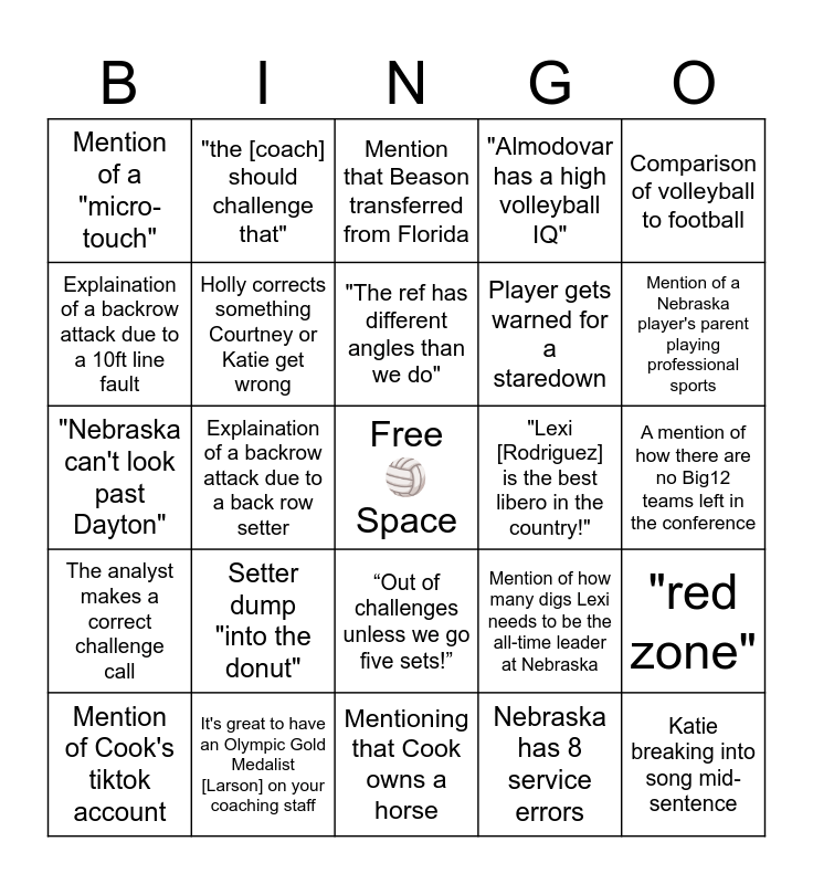 This bingo card has a free space and 64 words: "campfire", "I was listening to the huddle", "Oh, that's a good short serve!", "red zone", "reverse sweep", "Takes a little something off it...", "the [coach] should challenge that", "the ball doesn't / don't lie", "The ref has different angles than we do", “Balanced team”, “Out of challenges unless we go five sets!”, “Ripped into the cross court”, A mention of how there are no Big12 teams left in the conference, Comparison of volleyball to football, Cut to dance party celebration, Explaination of a backrow attack due to a 10ft line fault, Explaination of a backrow attack due to a back row setter, Mention of a "micro-touch", Mention of the number of players that graduate, Player gets warned for a staredown, Setter dump "into the donut", The analyst makes a correct challenge call, "Almodovar has a high volleyball IQ", "Miller has a high volleyball IQ", "Sarkissian has a high volleyball IQ", Dayton has 8 service errors, Dayton wins the first set, Mention of a Dayton player's parent playing professional sports, Mention of Horsmon being the regional COY, The analyst makes a incorrect challenge call, The analyst says, "Oh, I don't know" in relation to a challenge call, "Beason has a high volleyball IQ", "Bergen has a high volleyball IQ", "Murray has a high volleyball IQ", Mention of a Nebraska player's parent playing professional sports, Mention of Cook's tiktok account, Mention of Rodriguez as the first libero to win regional POY, Nebraska has 8 service errors, Nebraska wins the first set, Holly corrects something Courtney or Katie get wrong, "Nebraska can't look past Dayton", "Lexi [Rodriguez] is the best libero in the country!", “what makes Bergen great is how deceptive her setting is”, She [Lexi Almodovar] is only 5'8"!, Katie says, “are you kidding me”, Katie breaking into song mid-sentence, It's great to have an Olympic Gold Medalist [Larson] on your coaching staff, "She's a gamer", Mention of how many digs Lexi needs to be the all-time leader at Nebraska, "ARE YOU NOT ENTERTAINED?", "She [Choboy] flies all over the court!", Gratuitous shot of Josiah Allick, Mentioning that Cook owns a horse, "Dayton has nothing to lose", "insane" while describing the play, Laney and/or Liv would be the starting libero on most other teams, Mention that Beason transferred from Florida, Mention that Landfair transferred from Minnesota, Mention that Landfair was a previous B1G POY, Enthusiasm about Andi Jackson's athleticsm, Mention of how Nebraska all played on the NT together, Mention that Blackwell transferred from San Diego, Mention how Kennedi Orr is making a place for herself at Nebraska and Mention of Murray's struggles over the off season.