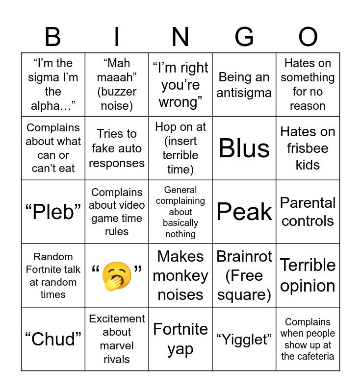 This bingo card has 25 words: “🥱”, Fortnite yap, Hop on at (insert terrible time), “Chud”, Hates on something for no reason, “I’m the sigma I’m the alpha…”, Complains about what can or can’t eat, “Mah maaah” (buzzer noise), Peak, Makes monkey noises, Blus, “Pleb”, Brainrot (Free square), Terrible opinion, Tries to fake auto responses, Complains when people show up at the cafeteria, Parental controls, “I’m right you’re wrong”, Hates on frisbee kids, Complains about video game time rules, General complaining about basically nothing, Excitement about marvel rivals, Random Fortnite talk at random times, Being an antisigma and “Yigglet”.