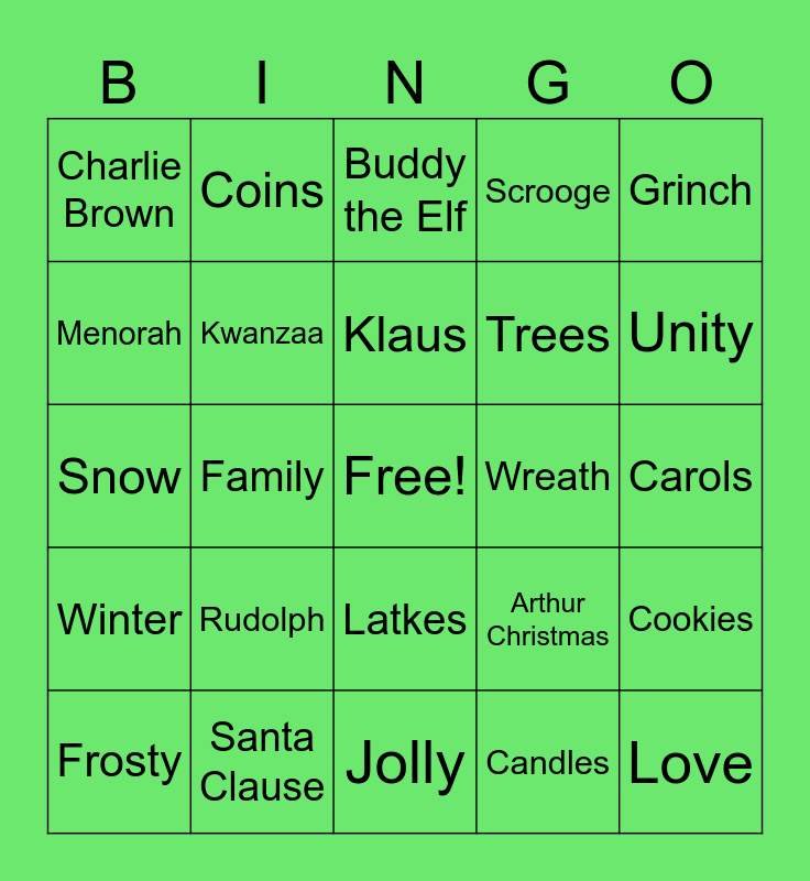 This bingo card has a free space and 24 words: Rudolph, Santa Clause, Klaus, Frosty, Grinch, Charlie Brown, Menorah, Coins, Wreath, Latkes, Trees, Snow, Arthur Christmas, Cookies, Kwanzaa, Candles, Carols, Buddy the Elf, Unity, Family, Love, Winter, Scrooge and Jolly.
