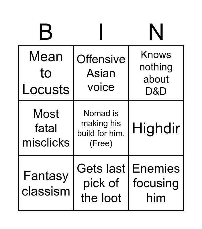 This bingo card has a free space and 8 words: Highdir, Knows nothing about D&D, Offensive Asian voice, Fantasy classism, Mean to Locusts, Enemies focusing him, Most fatal misclicks and Gets last pick of the loot.