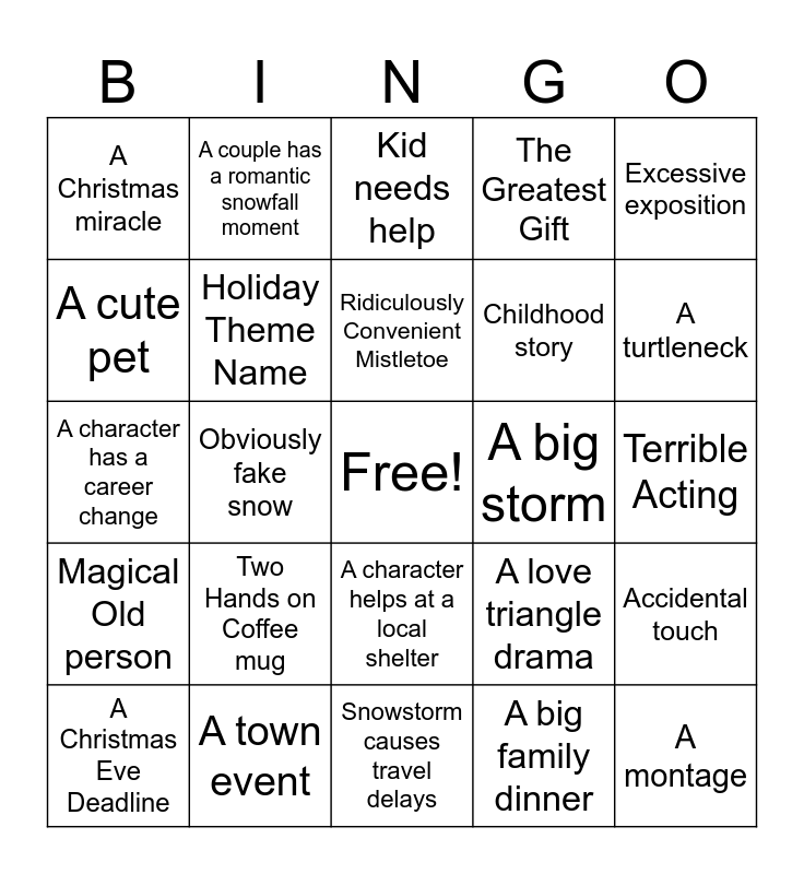 This bingo card has a free space and 38 words: A Made up place, Interrupted Kiss, Mistaken for a couple, Holiday Theme Name, Accidental touch, Two Hands on Coffee mug, Ridiculously Convenient Mistletoe, Way too cheesy of a line, Excessive exposition, Childhood story, Obviously fake snow, The Greatest Gift, A montage, Terrible Acting, A cute pet, Magical Old person, Poinsettia, Kid needs help, An important secret is revealed, A big storm, A Christmas miracle, A town event, A turtleneck, A Christmas Eve Deadline, Corporate Green, Snowstorm causes travel delays, Someone bakes cookies, A decorated Christmas tree, A character wears a Christmas sweater, Small town setting, Someone is skeptical about Christmas, A character helps at a local shelter, A big family dinner, A couple has a romantic snowfall moment, A character learns the true meaning of Christmas, A love triangle drama, A character has a career change and A cute pet steals the spotlight.