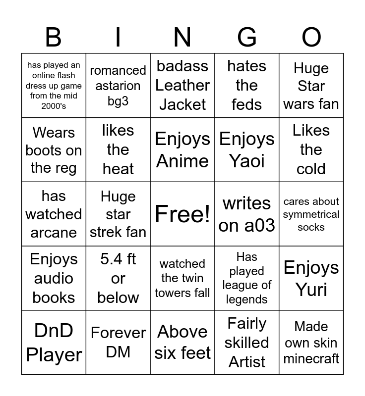 This bingo card has a free space and 24 words: 5.4 ft or below, Forever DM, Enjoys Anime, DnD Player, Huge Star wars fan, has played an online flash dress up game from the mid 2000's, Wears boots on the reg, romanced astarion bg3, writes on a03, watched the twin towers fall, Enjoys Yaoi, has watched arcane, Has played league of legends, Enjoys Yuri, likes the heat, Fairly skilled Artist, cares about symmetrical socks, badass Leather Jacket, Likes the cold, Huge star strek fan, Made own skin minecraft, Enjoys audio books, hates the feds and Above six feet.