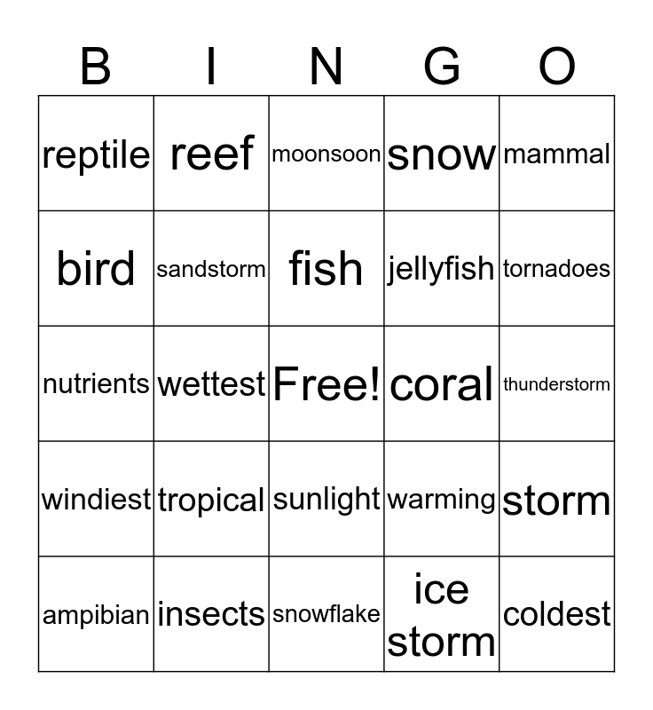 This bingo card has a free space and 24 words: tropical, insects, fish, ampibian, mammal, reptile, bird, reef, coral, sunlight, jellyfish, nutrients, warming, storm, sandstorm, ice storm, thunderstorm, moonsoon, tornadoes, wettest, coldest, windiest, snow and snowflake.