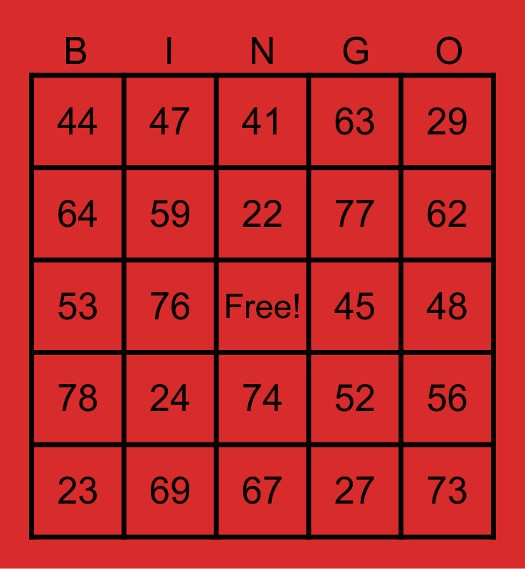 This bingo card has a free space and 24 words: 23, 24, 22, 27, 29, 44, 47, 41, 45, 48, 53, 59, 52, 56, 64, 69, 67, 63, 62, 78, 76, 74, 77 and 73.