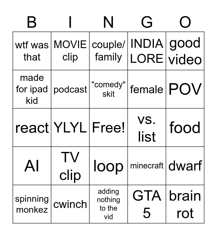 This bingo card has a free space and 24 words: TV clip, cwinch, "comedy" skit, spinning monkez, good video, wtf was that, made for ipad kid, MOVIE clip, vs. list, loop, female, react, minecraft, dwarf, podcast, GTA 5, food, couple/ family, POV, YLYL, brain rot, AI, INDIA LORE and adding nothing to the vid.