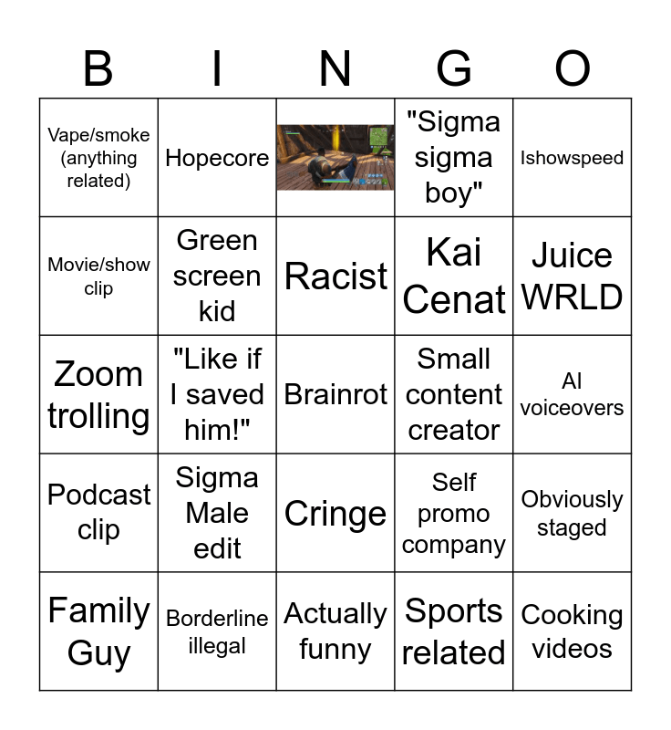This bingo card has 1 images, a free space and 23 words: Sigma Male edit, Borderline illegal, Racist, Family Guy, Ishowspeed, Vape/smoke (anything related), Movie/show clip, Hopecore, Small content creator, Cringe, Kai Cenat, Zoom trolling, Self promo company, Obviously staged, Green screen kid, Sports related, AI voiceovers, Juice WRLD, "Like if I saved him!", Cooking videos, Podcast clip, "Sigma sigma boy" and Actually funny.