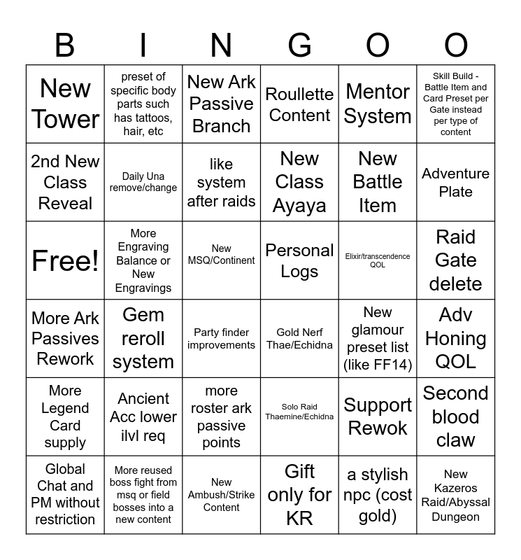 This bingo card has 36 words: Solo Raid Thaemine/Echidna, more roster ark passive points, Gift only for KR, 2nd New Class Reveal, More Ark Passives Rework, Personal Logs, Daily Una remove/change, New Ambush/Strike Content, Mentor System, Support Rewok, Adventure Plate, Roullette Content, Second blood claw, More Engraving Balance or New Engravings, New Class Ayaya, New Tower, More Legend Card supply, Elixir/transcendence QOL, Free!, New Ark Passive Branch, New MSQ/Continent, Gem reroll system, Gold Nerf Thae/Echidna, Party finder improvements, New glamour preset list (like FF14), preset of specific body parts such has tattoos, hair, etc, New Battle Item, More reused boss fight from msq or field bosses into a new content, like system after raids, Skill Build - Battle Item and Card Preset per Gate instead per type of content, New Kazeros Raid/Abyssal Dungeon, Global Chat and PM without restriction, Adv Honing QOL, Raid Gate delete, Ancient Acc lower ilvl req and a stylish npc (cost gold).
