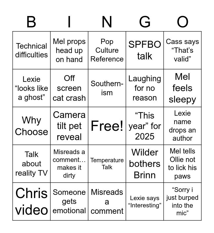 This bingo card has a free space and 52 words: “Romantasy era”, “Sorry i just burped into the mic”, Lexie starts a sentence… and doesn’t finish, Misreads a comment, Misreads a comment… makes it dirty, Lexie lays down, Mel props head up on hand, Mel tells Ollie to move, Lexie “looks like a ghost”, Cat cuddles, Off screen cat crash, Miley chaos, Mel tells Ollie not to lick his paws, Wilder bothers Brinn, Someone orders food, Canadian-ism, Southern-ism, “This year” for 2025, Cat/s on at least 2 screens, Cass says “That’s valid”, Camera tilt pet reveal, Lexie says “Interesting”, Technical difficulties, Laughing for no reason, Lexie yells at Bowser, Someone kicked off screen, Make a toast, Google a food, Mel feels sleepy, Mel says HEY (offended), “Might could”, SPFBO talk, “I forgot about that”, Cass/Lexie Say “Grand Mel Mel”, Cass sings/dances, Pop Culture Reference, Someone gets emotional, Someone shares phone screen, PAL, Covered face laughing, “I need to read that”, Lexie name drops an author, Talk about reality TV, Cassidy’s Cult, Temperature Talk, Interrupted by a call, “Share in discord”, Why Choose, Eyeballs, “I'm leaving”, Chris video and Reading journal.