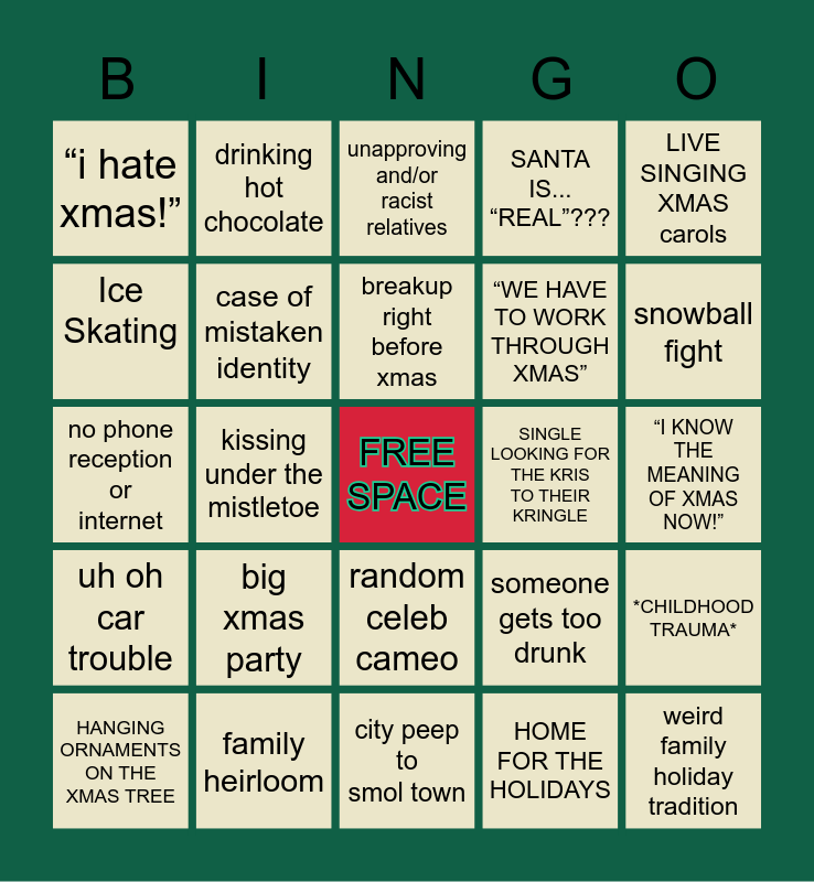 This bingo card has a free space and 24 words: big xmas party, family heirloom, breakup right before xmas, HANGING ORNAMENTS ON THE XMAS TREE, LIVE SINGING XMAS carols, “i hate xmas!”, Ice Skating, drinking hot chocolate, SINGLE LOOKING FOR THE KRIS TO THEIR KRINGLE, random celeb cameo, “WE HAVE TO WORK THROUGH XMAS”, no phone reception or internet, someone gets too drunk, *CHILDHOOD TRAUMA*, case of mistaken identity, HOME FOR THE HOLIDAYS, “I KNOW THE MEANING OF XMAS NOW!”, unapproving and/or racist relatives, snowball fight, kissing under the mistletoe, weird family holiday tradition, uh oh car trouble, SANTA IS... “REAL”??? and city peep to smol town.
