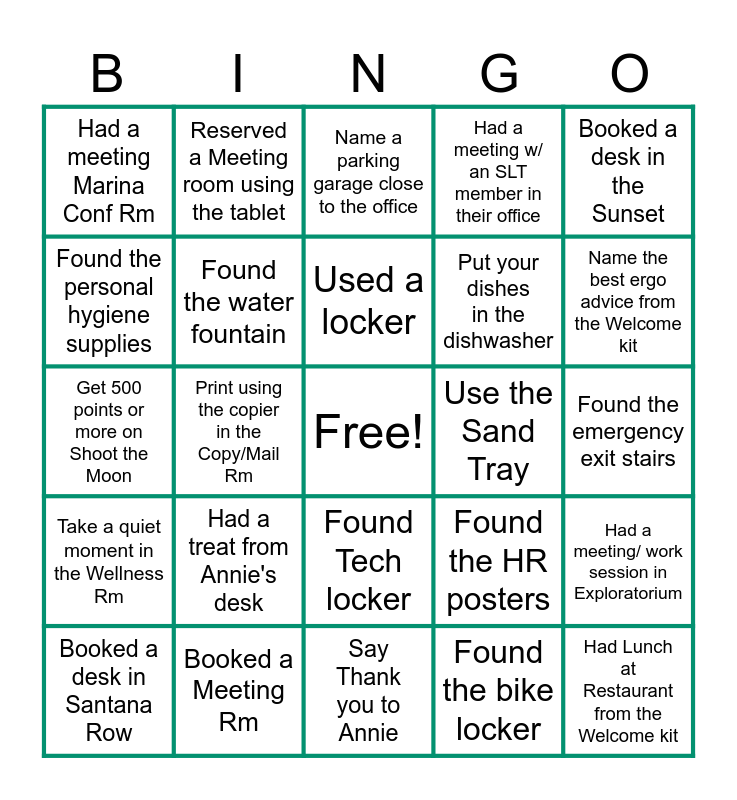 This bingo card has a free space and 24 words: Had a treat from Annie's desk, Booked a Meeting Rm, Used a locker, Booked a desk in Santana Row, Booked a desk in the Sunset, Had a meeting Marina Conf Rm, Found the personal hygiene supplies, Reserved a Meeting room using the tablet, Use the Sand Tray, Found Tech locker, Put your dishes in the dishwasher, Get 500 points or more on Shoot the Moon, Found the HR posters, Had a meeting/ work session in Exploratorium, Found the water fountain, Found the bike locker, Found the emergency exit stairs, Name a parking garage close to the office, Name the best ergo advice from the Welcome kit, Print using the copier in the Copy/Mail Rm, Had Lunch at Restaurant from the Welcome kit, Take a quiet moment in the Wellness Rm, Had a meeting w/ an SLT member in their office and Say Thank you to Annie.