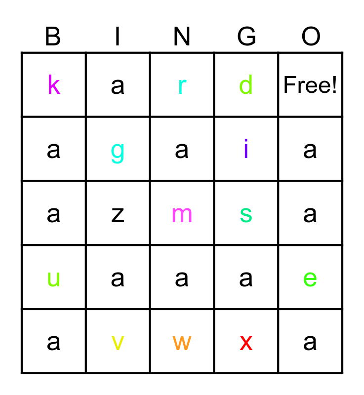 This bingo card has a free space and 55 words: a, b, c, d, e, f, g, h, i, j, k, l, n, o, p, q, r, s, t, u, v, w, x, Free!, y, z, a, a, a, a, a, a, a, a, a, a, a, a, a, a, a, a, a, a, a, a, a, a, a, a, a, a, a, a and a.