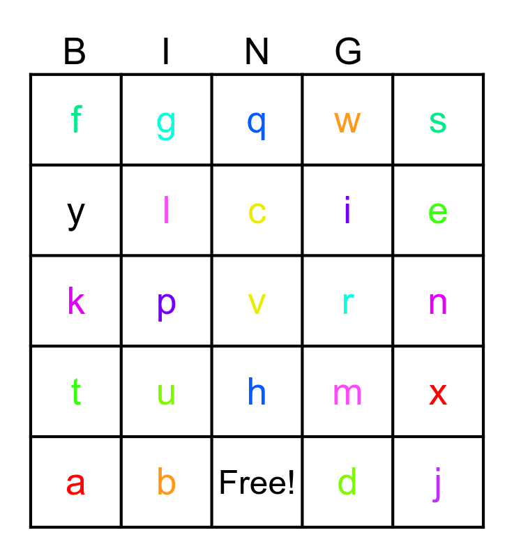 This bingo card has 27 words: a, b, c, d, e, f, g, h, i, j, k, l, Free!, m, n, o, p, q, r, s, t, u, v, w, x, y and z.